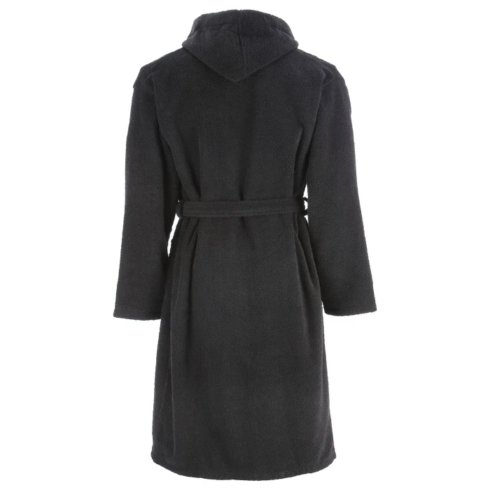 Accappatoio con cappuccio e apertura incrociata sul davanti. Maniche a giro, passanti per cintura sul retro e sulle cuciture laterali per mantenere la cintura in posizione. Tasche applicate sulla parte bassa frontale. Stemmi del club ricamati e applicati a punto a macchina sul lato destro del petto, come indossato. Cuciture doppie ai polsini e allorlo.