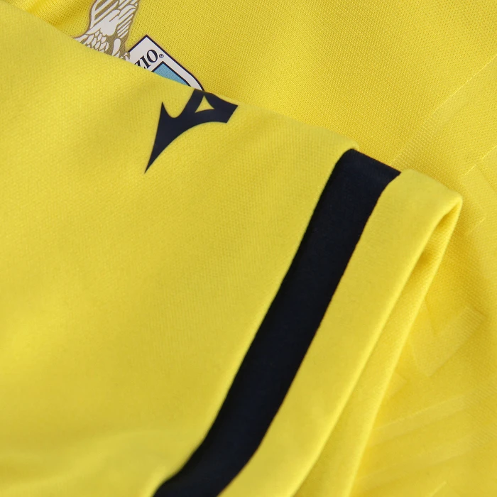 Il design presenta la scritta S.S. Lazio stampata a rilievo tono su tono, all’interno di un motivo geometrico che si ripete sul davanti. Il collo a V, i polsini delle maniche in tessuto con contrasto bianco/navy e il logo del club in silicone mostrato fieramente sul petto a sinistra, definiscono lo stile della maglia Away.