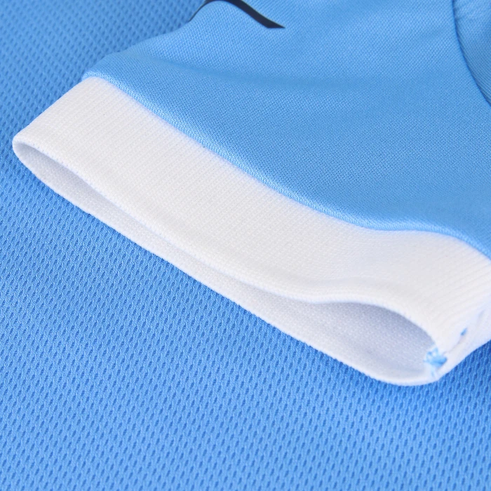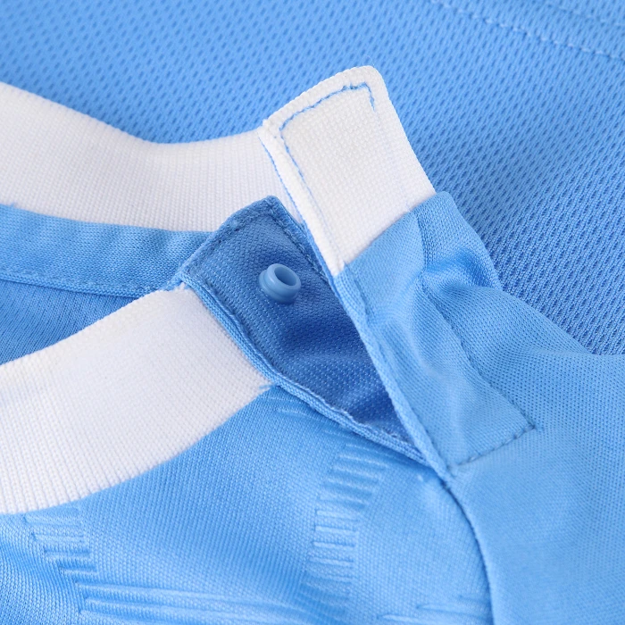 Maglia – pannello frontale sublimatico con retro in mesh e maniche raglan lisce. Colletto a girocollo e polsini in tessuto tono su tono. Aperture sagomate alle maniche raglan con 2 bottoni automatici su entrambi i lati del colletto. Nastro interno collo semplice. Stemma principale del club e logo Mizuno applicati a caldo su petto e maniche, con scritta “9 GENNAIO 1990” sul retro del collo.