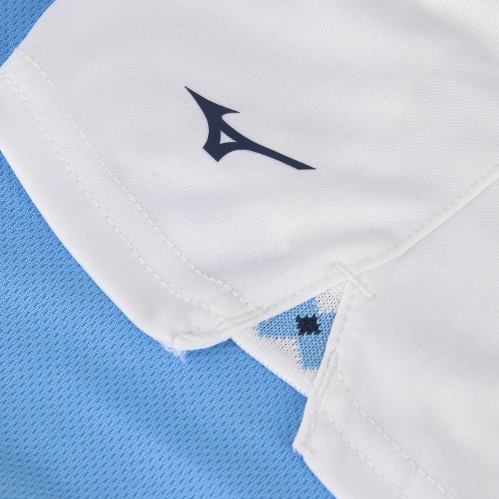 Sulle gambe spiccano il logo Mizuno in silicone applicato a caldo e il prestigioso crest del club S.S. Lazio in silicone 3D effetto tatami, simboli di qualità, tradizione e autentica passione sportiva.