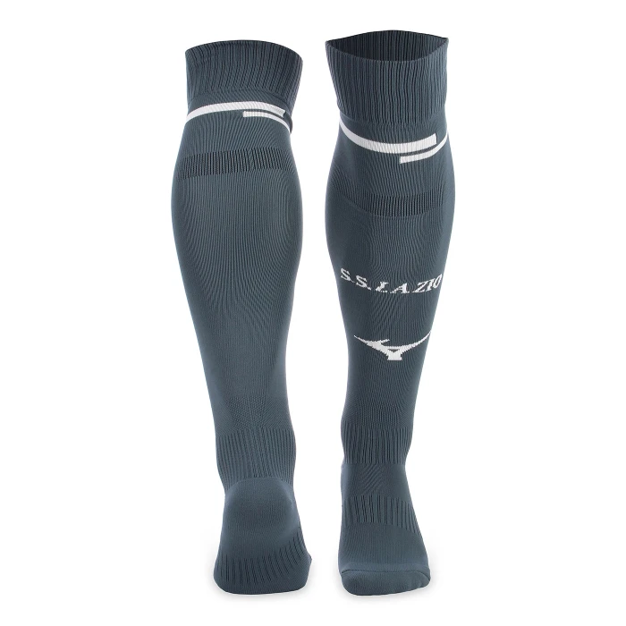 Calzettoni che completano la divisa Away con un motivo a blocchi a contrasto lavorato a maglia sulla parte superiore della gamba. I loghi S.S. Lazio e Mizuno sono integrati a maglia sulla parte frontale. Il design del calzettone assicura il massimo comfort durante il movimento, grazie allimbottitura in spugna su punta e tallone e al sostegno elastico su polpaccio, caviglia e arco plantare.