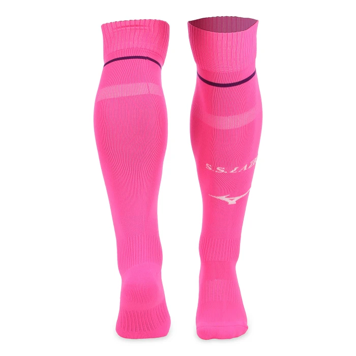 Calzini Motivo jacquard a blocchi a contrasto sulla parte superiore delle gambe. Loghi S.S. LAZIO e Mizuno integrati a maglia su entrambe le gambe. Supporto elastico su polpaccio, caviglia e arco plantare.