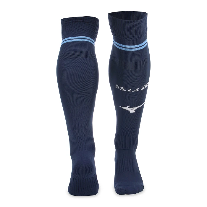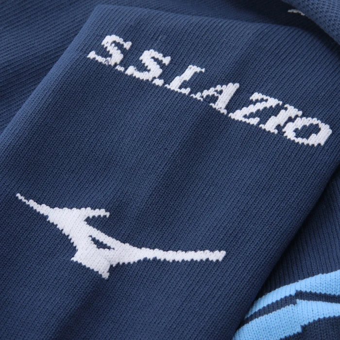 Calzini Motivo jacquard a blocchi a contrasto sulla parte superiore delle gambe. Loghi S.S. LAZIO e Mizuno integrati a maglia su entrambe le gambe. Supporto elastico su polpaccio, caviglia e arco plantare.