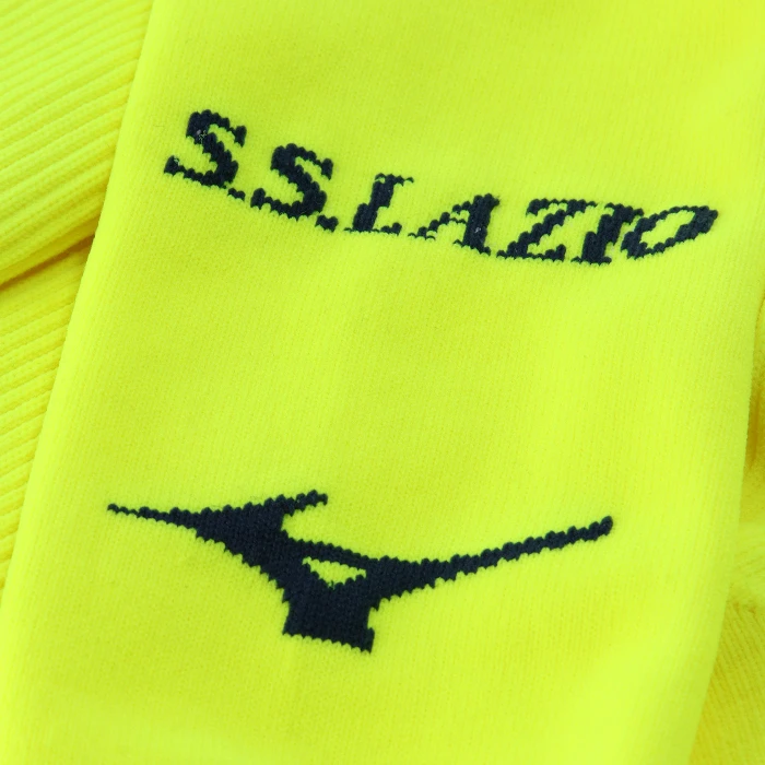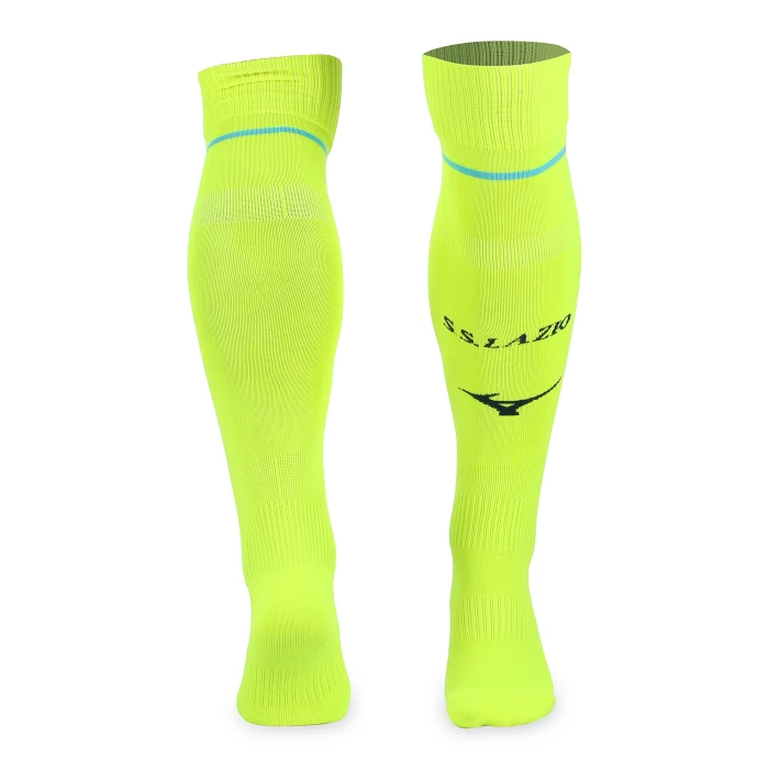 Calzettoni che completano la divisa Away con un motivo a blocchi a contrasto lavorato a maglia sulla parte superiore della gamba. I loghi S.S. Lazio e Mizuno sono integrati a maglia sulla parte frontale. Il design del calzettone assicura il massimo comfort durante il movimento, grazie allimbottitura in spugna su punta e tallone e al sostegno elastico su polpaccio, caviglia e arco plantare.