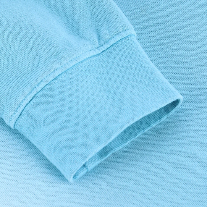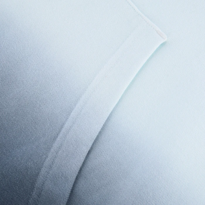 Felpa con cappuccio con effetto sfumato su tutta la parte anteriore e posteriore del corpo. Cappuccio in 3 sezioni completamente foderato, con coulisse piatta passante attraverso occhielli in metallo sul davanti. Nastro interno collo posteriore in tinta unita. Spalle avanzate con cuciture a vista. Tasca a marsupio sul fondo anteriore con cuciture decorative.