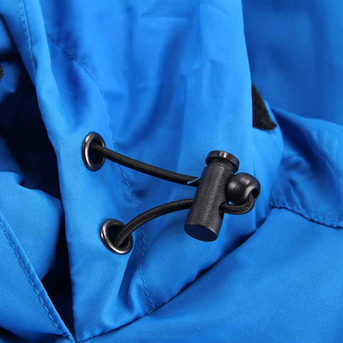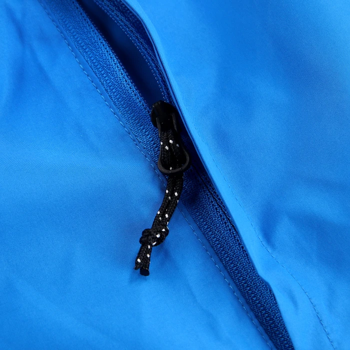 Giacca: Parte anteriore, posteriore e maniche raglan superiori in tinta unita, con pannelli a contrasto sulle maniche inferiori. Colletto a costine tipo funnel con nastro interno collo in tinta unita. Zip frontale intera con garage e protezione interna. Cuciture sagomate sul davanti con tasche coperte, zip rovesciate e cursori di sicurezza. Pannelli a contrasto lungo la parte inferiore delle maniche.