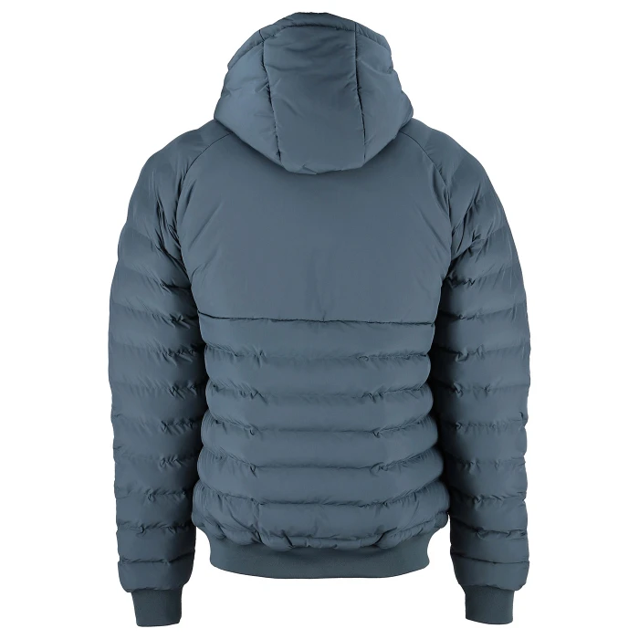 Giacca Bomber con parte anteriore, posteriore e maniche raglan trapuntate. Carré posteriore e cappuccio in tinta unita. Cappuccio in 3 sezioni regolabile, con coulisse elastica passante attraverso occhielli in metallo e fermacorda in plastica. Zip frontale rovesciata con garage e protezione interna. Polsini e fondo del corpo in costina. Tasche a filetto sagomate sul fondo anteriore con zip rovesciate coperte.