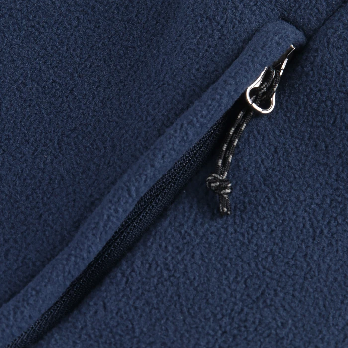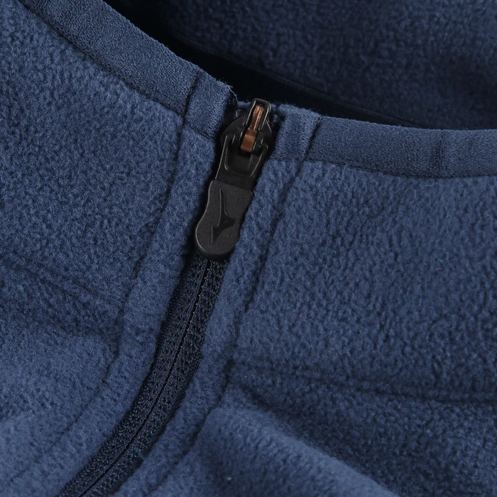 Top in pile con zip intera, maniche lunghe a giro e collo alto. Nastro interno collo posteriore in tinta unita. Zip frontale intera rovesciata con cursore bloccabile, garage e protezione interna. Spalle avanzate con cuciture a vista. Cuciture laterali sagomate con tasche coperte, zip rovesciate e tiranti mélange.