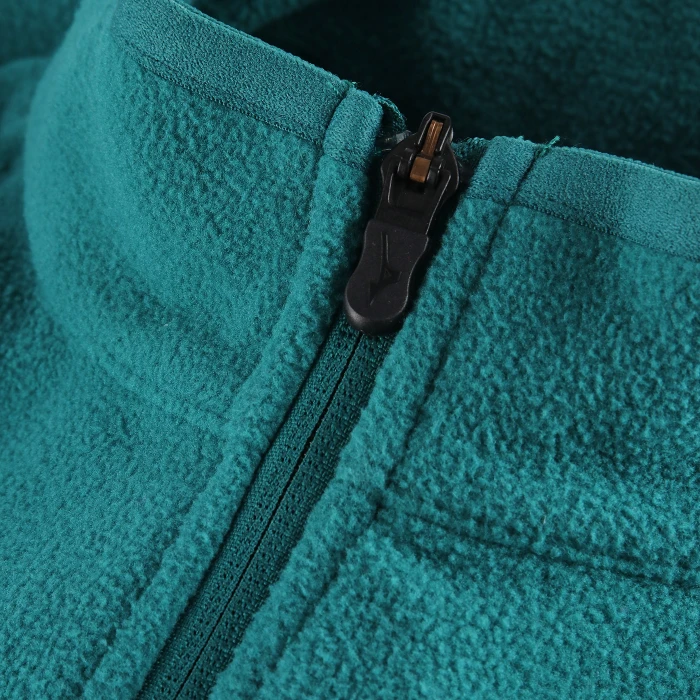 Top in pile con zip intera, maniche lunghe a giro e collo alto. Nastro interno collo posteriore in tinta unita. Zip frontale intera rovesciata con cursore bloccabile, garage e protezione interna. Spalle avanzate con cuciture a vista. Cuciture laterali sagomate con tasche coperte, zip rovesciate e tiranti mélange.