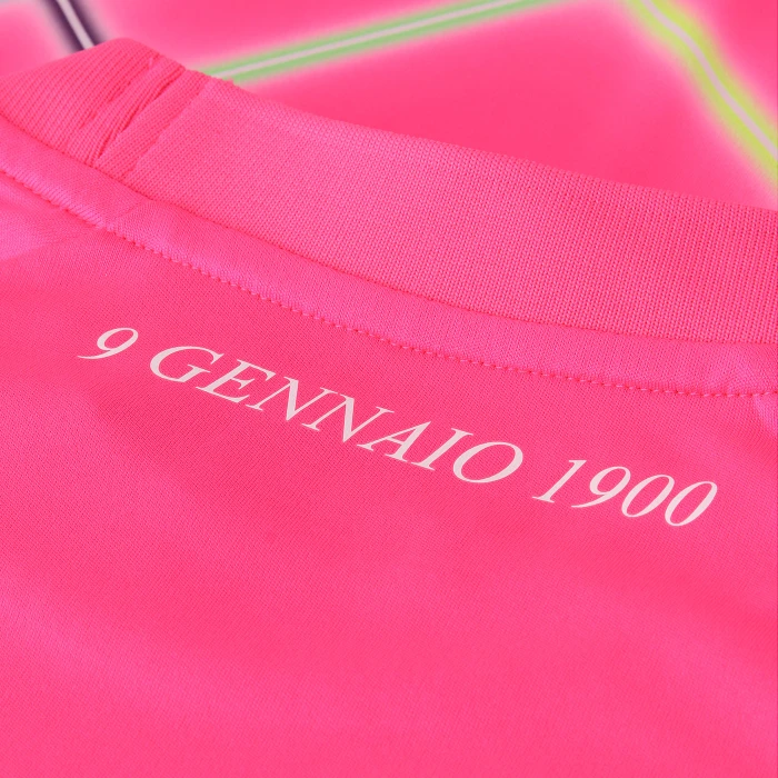 Maglia Pannello frontale in rilievo, retro in mesh e maniche raglan lisce. Colletto girocollo e polsini in costina tinta unita. Aperture laterali al colletto con due bottoncini automatici per lato, per una vestibilità facile e sicura. Nastro interno collo semplice. Crest principale del club e logo Mizuno applicati a caldo su petto e maniche. Scritta 9 GENNAIO 1900 applicata a caldo sul retro del collo.