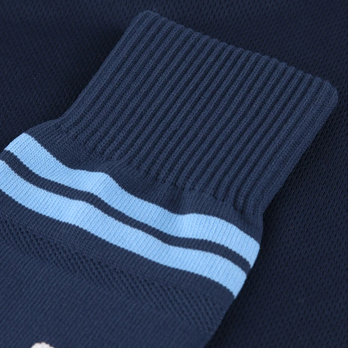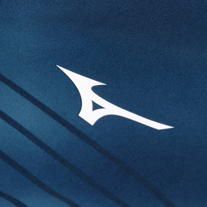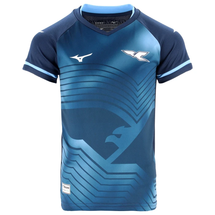 Maglia – pannello frontale sublimatico con retro in mesh e maniche raglan. Colletto a “V” e polsini in tessuto tono su tono. Nastro interno collo semplice. Stemma principale del club e logo Mizuno applicati a caldo su petto e maniche, con scritta “9 GENNAIO 1990” sul retro del collo.