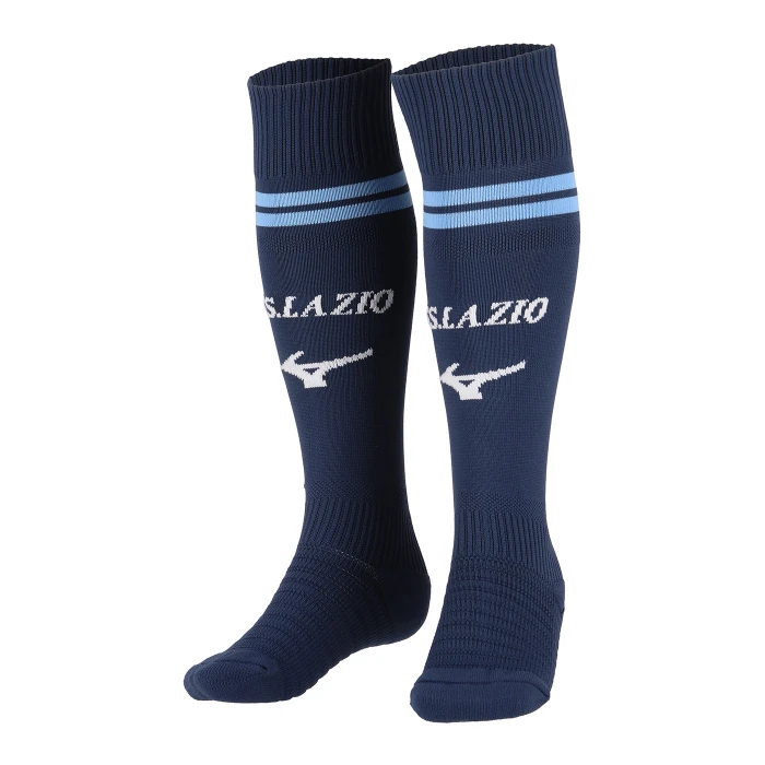 Calzettoni – doppia striscia a contrasto lavorata a jacquard sulla parte superiore della gamba, loghi S.S. Lazio e Mizuno intrecciati su entrambe le gambe. Supporto elastico su polpaccio superiore, caviglia e arco plantare.