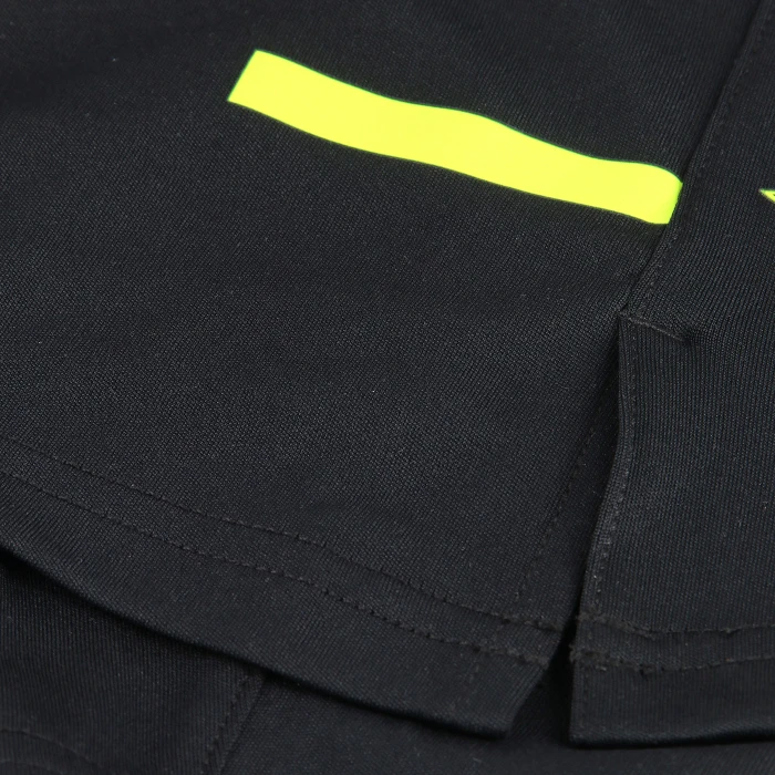 Giacca: Parte anteriore, posteriore e maniche raglan superiori in tinta unita, con pannelli a contrasto sulle maniche inferiori. Colletto a costine tipo funnel con nastro interno collo in tinta unita. Zip frontale intera con garage e protezione interna. Cuciture sagomate sul davanti con tasche coperte, zip rovesciate e cursori di sicurezza. Pannelli a contrasto lungo la parte inferiore delle maniche.