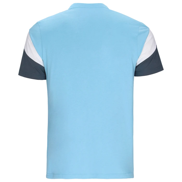 T-shirt a maniche corte con pannelli a contrasto tagliati e cuciti sulle maniche. Parte frontale, posteriore e girocollo in tinta unita, con nastro interno collo posteriore in tinta unita.
