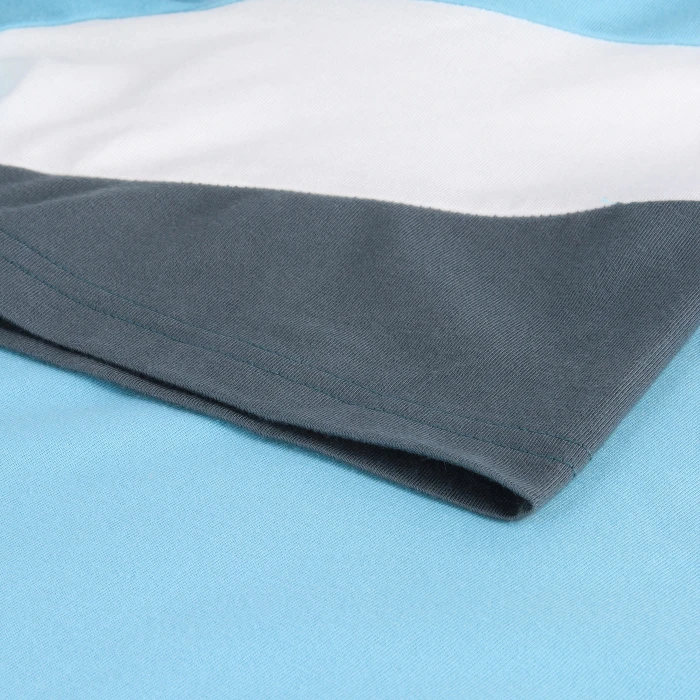 T-shirt a maniche corte con pannelli a contrasto tagliati e cuciti sulle maniche. Parte frontale, posteriore e girocollo in tinta unita, con nastro interno collo posteriore in tinta unita.