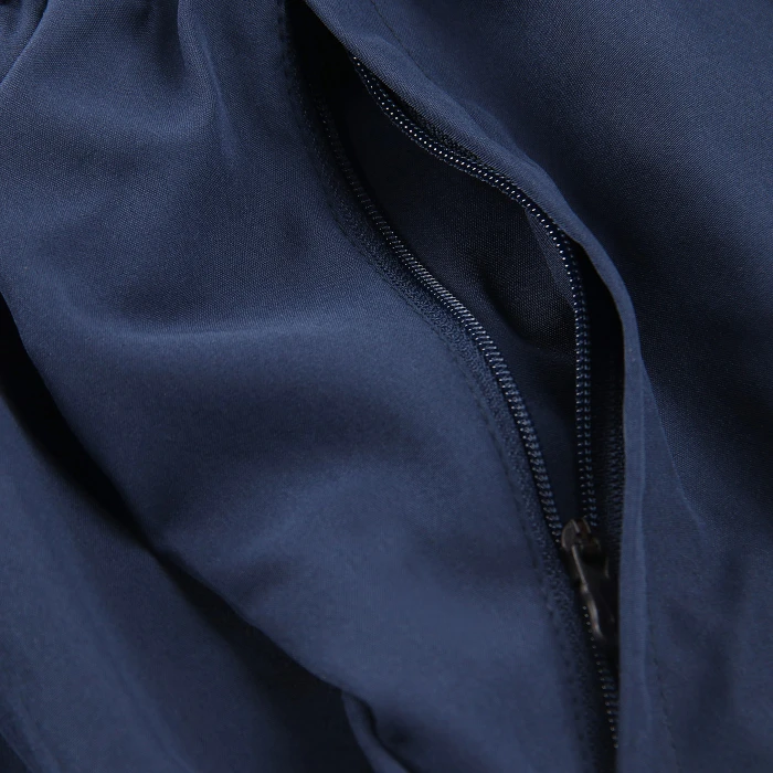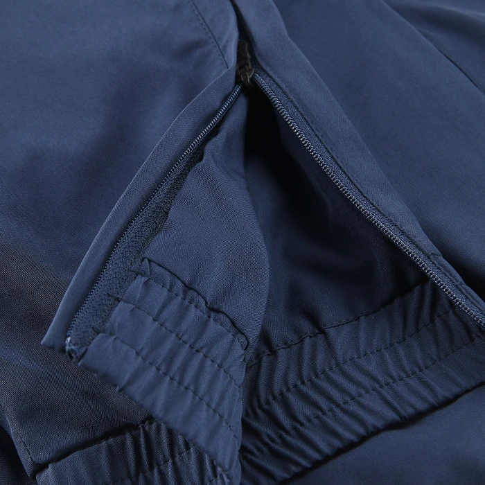 Pantaloni con fascia elastica in vita integrata e coulisse piatta interna. Cuciture laterali sagomate in avanti che integrano tasche con zip rovesciate coperte su entrambi i lati. Tassello interno per un maggiore comfort.